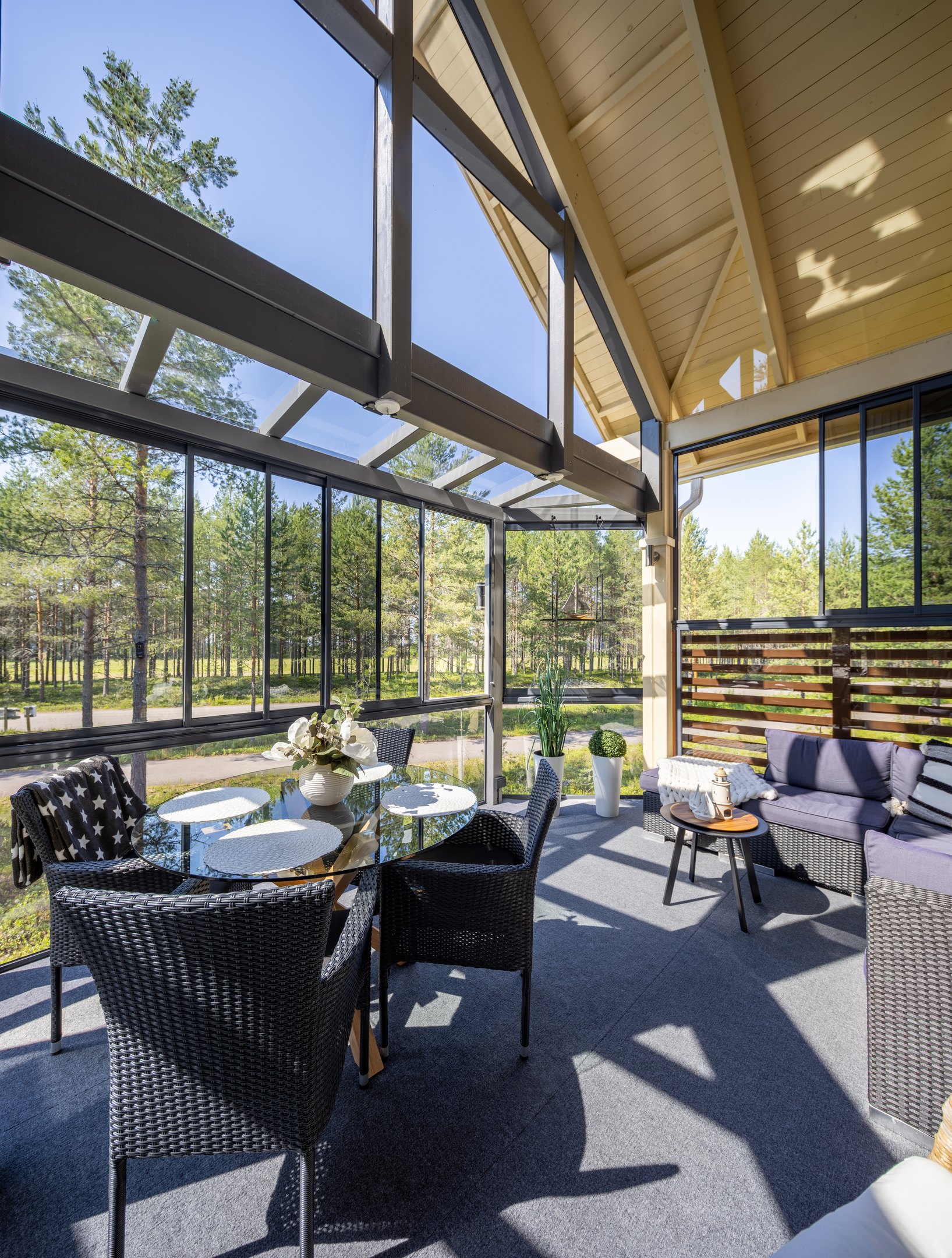 Lasiterassi on viihtyisä oleskelutila, joka suojaavien lasien ansiosta voidaan kalustaa ja sisustaa hyvin monenlaiseen käyttöön sisätilojen jatkeeksi. Lasiterassille voi tuoda elementtejä sekä pihalta että sisältä, jolloin raja eri tilojen välillä hälvenee.