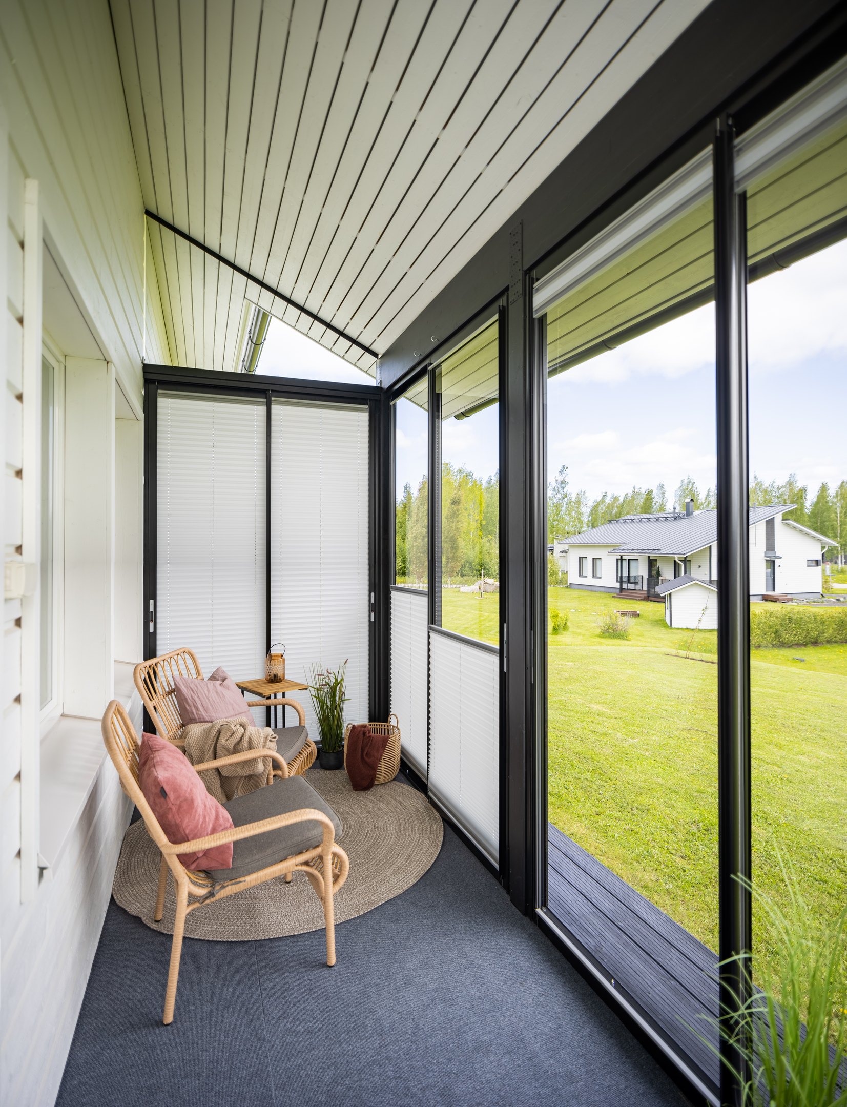 Terassilasitus on todella tiivis ja tukeva, vaikka sen profiilit ovat tyylikkäät ja sirot. Lasitus suojaa terassia tehokkaasti siitepölyltä, roskilta ja sateelta. Terassista on mahdollista nauttia rauhassa itikoilta ja liikenteen melulta. Saumattomasti lasitusten kanssa toimivat verhot tarjoavat puolestaan suojaa katseilta sekä auringolta.